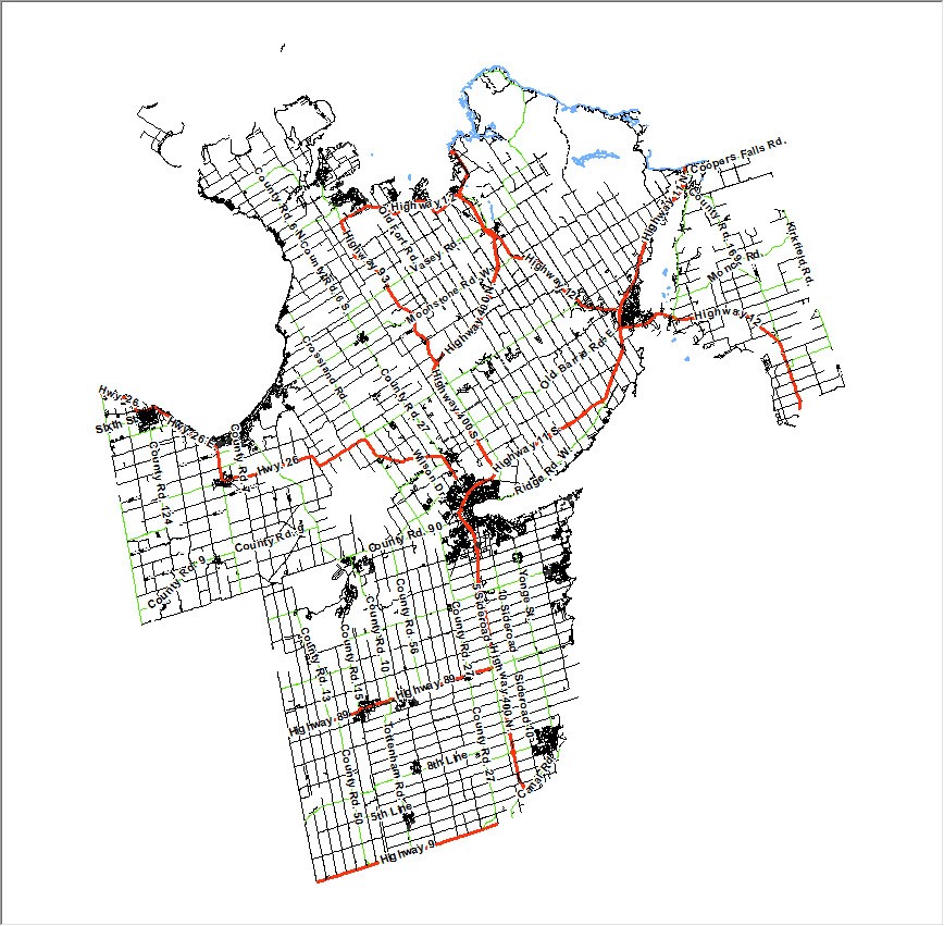 Description: Line feature class that outlines all of the roads within Simcoe County. This layer is primarily used for emergency response and address ranges are assigned to every street for 911 dispatch. Thisisclassified by the different roadowners and municipalities. Each road segment has its own unqiue indentifier (SLRN ID). Road segments are split where roads meet: other roads, railways, municipal borders, and emergency response boundaries, Segments are not created based on speed zones but speed limits are assigned to segments based on the prominent speed along that segment.